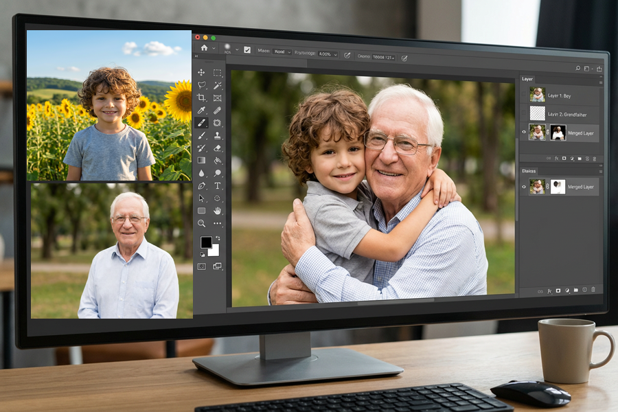 Es un servicio profesional donde unimos o fusionamos dos o varias fotografías para crear una sola foto completamente natural y coherente. Podemos unir personas que nunca se tomaron una foto juntas o que ya no están presentes, entregando como resultado una imagen única e inolvidable.
